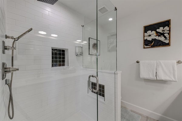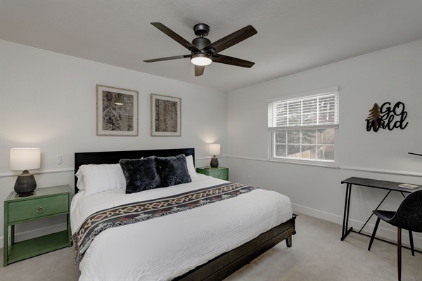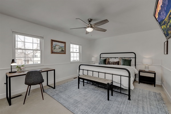 - Four upstairs rooms including large primary with en suite bath, one king and two queen beds.