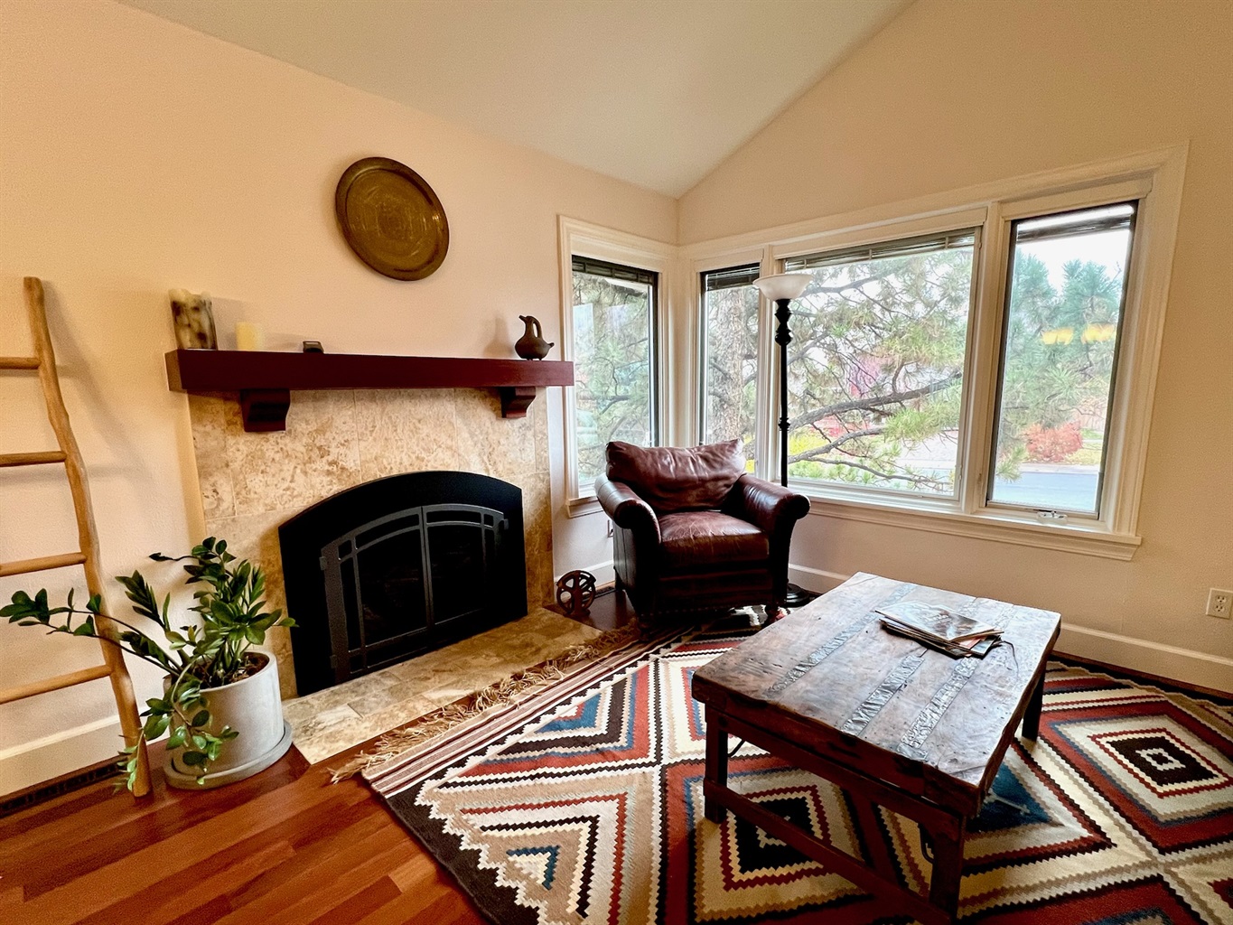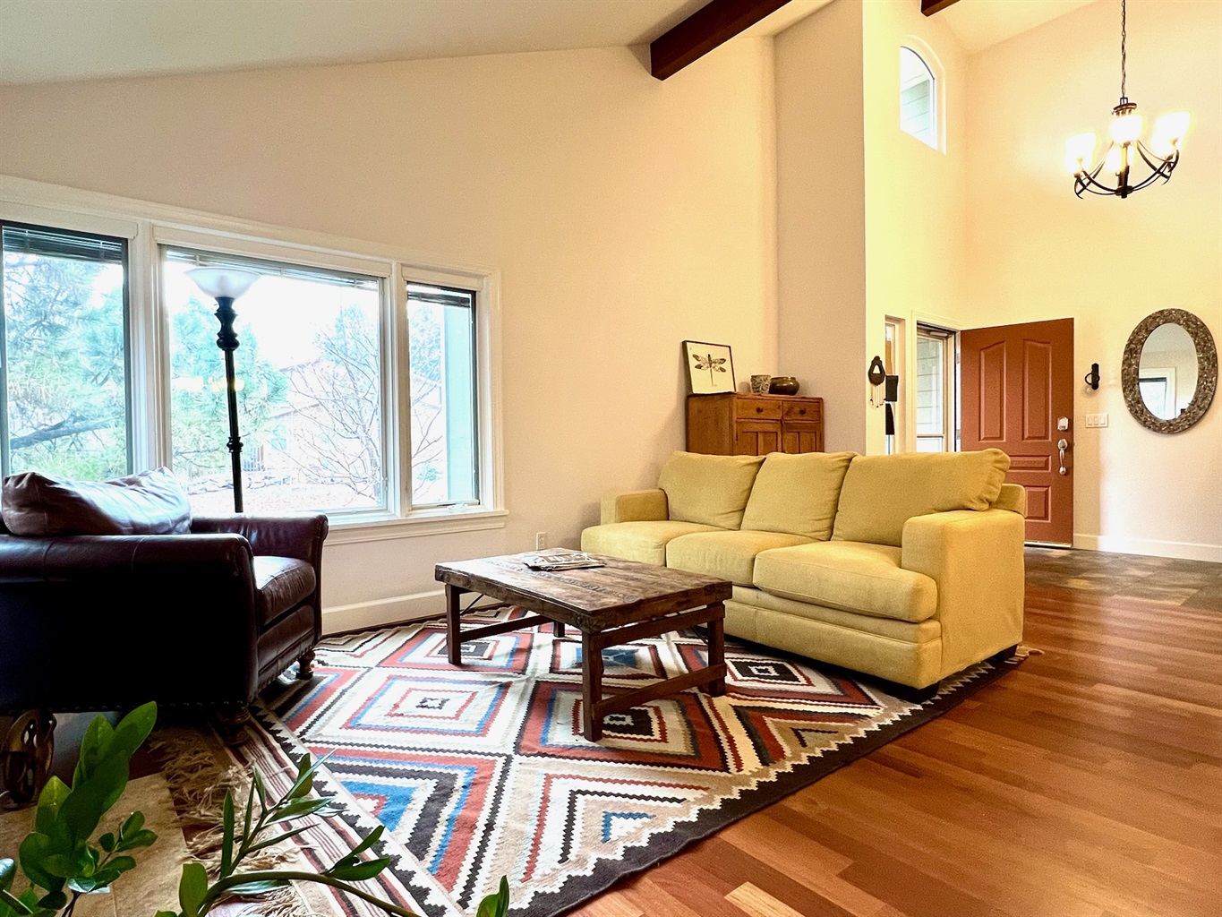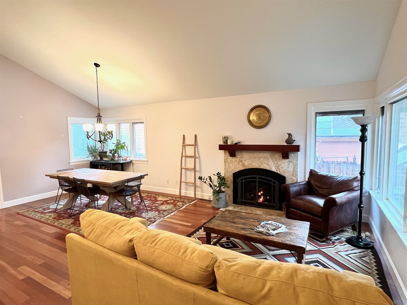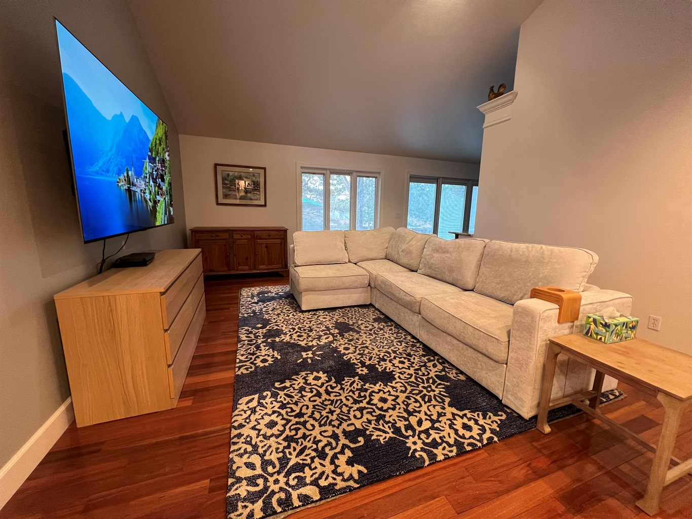 Cozy Living Room featuring Brazilian hardwoods and vaulted ceilings