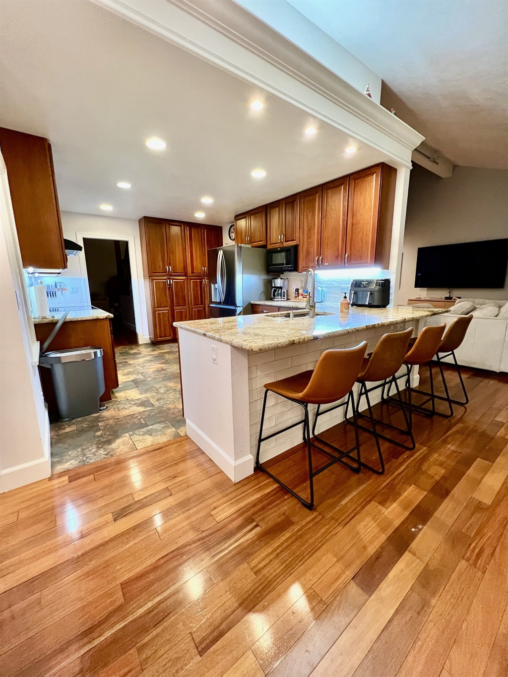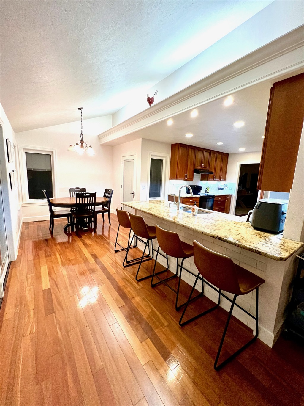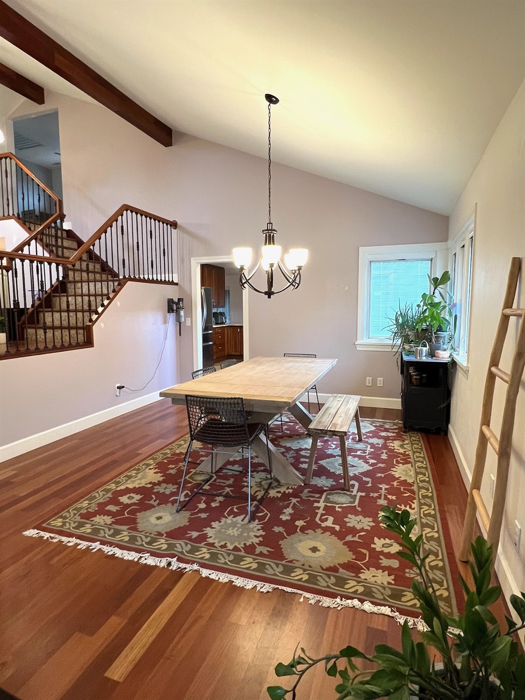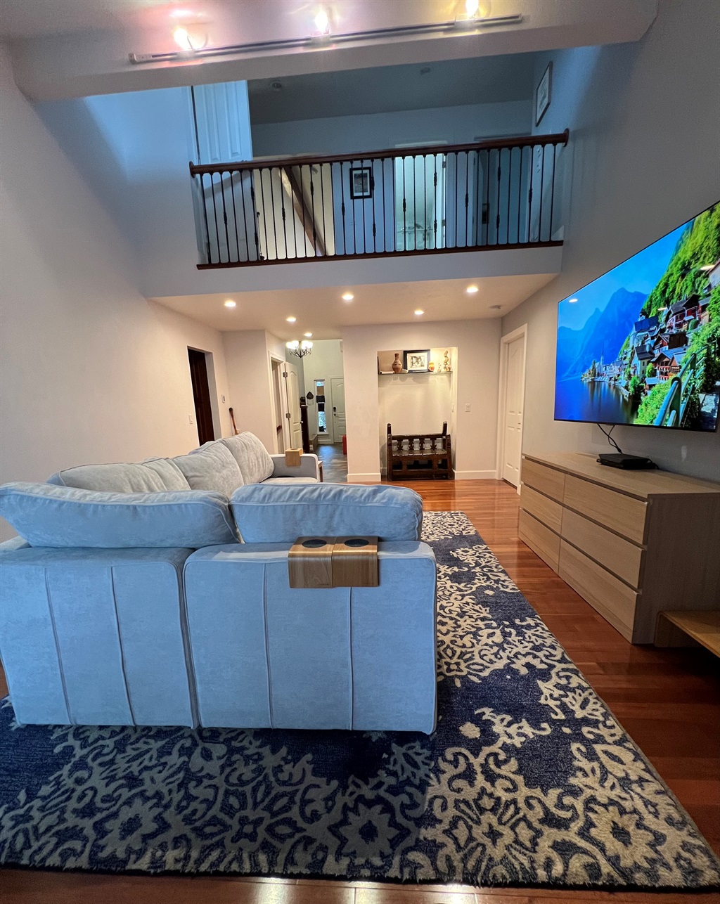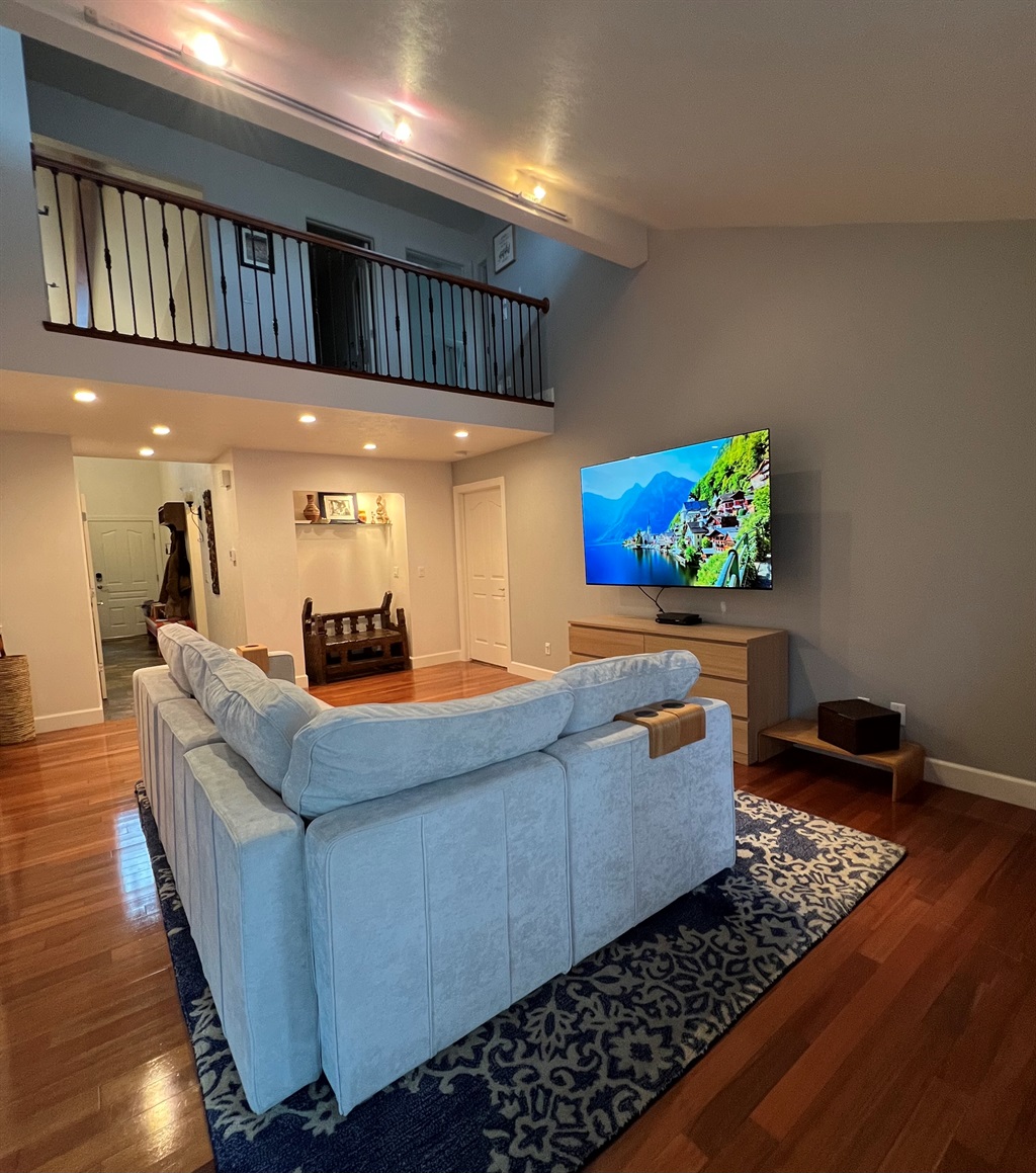 Cozy Living Room featuring Brazilian hardwoods and vaulted ceilings